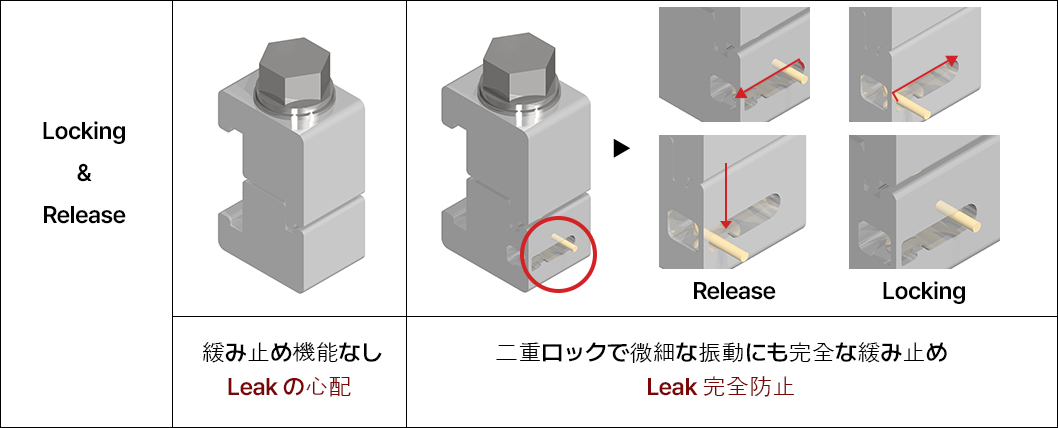 DC CLAMPは、二重ロック(Double Lock)器具を適用して半導体製造装置内のモーターやポンプの微細な振動にも緩むことなく、安定した固定を維持します